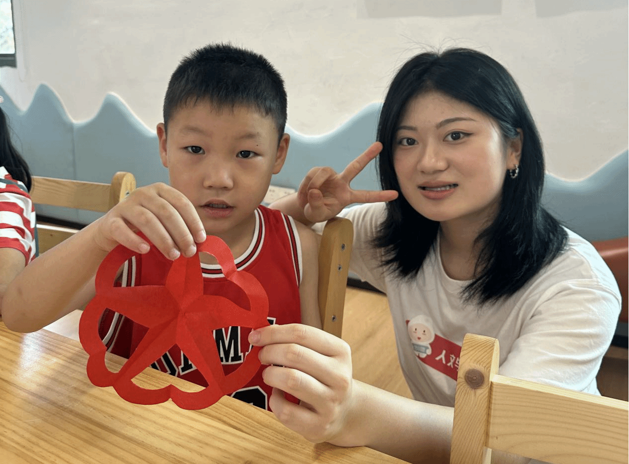 活动伊始,实践团成员带领孩子们回顾了新中国成立75年来的辉煌成就,随后讲解了剪纸的历史、技巧以及五角星所代表的深刻寓意,通过详细的步骤演示,指导孩子们亲手制作红色主题剪纸作品。孩子们在动手实践的过程中,不仅锻炼了手眼协调能力,更深刻体会到了剪纸艺术的魅力。
