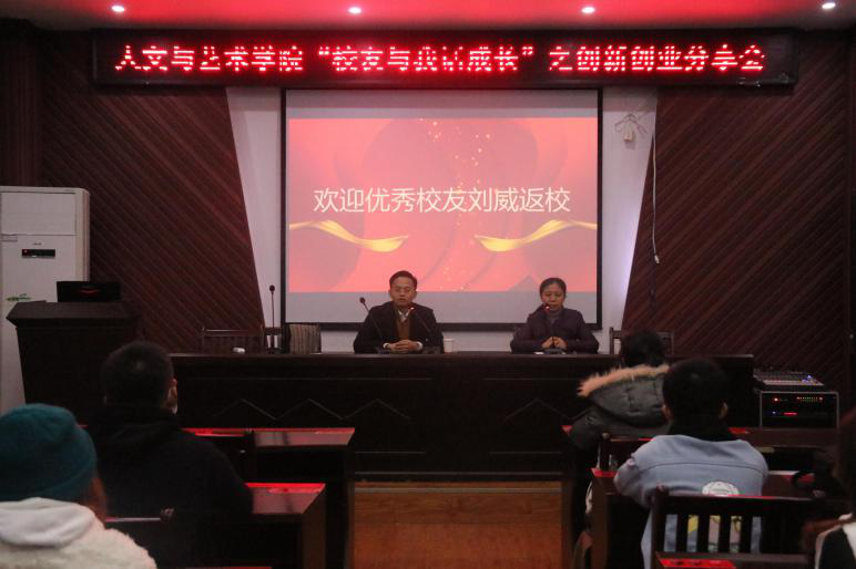 为发扬优秀校友的先锋模范作用,培养大学生创新创业精神,人文与艺术学院于12月29日下午4:00在艺术楼A231举办了“校友与我话成长”之创新创业分享会。此次创新创业分享会邀请到了我院10级新闻制作专业校友刘威进行主讲,全校各位专业近100人参加了此次分享会,会议由人文与艺术学院党委副书记王锐主持。