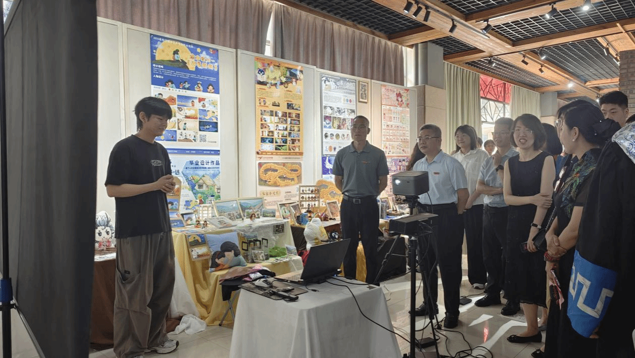 洪恩强随后宣布毕业作品展正式开幕。在观展环节,与会领导细致观摩了视觉传达设计、环境设计、产品设计、数字媒体艺术四个专业方向的百余件作品,对作品展现的专业性、创新性给予充分肯定,特别强调“设计教育要紧扣时代需求,引导学生要通过设计实践回应社会关切”。