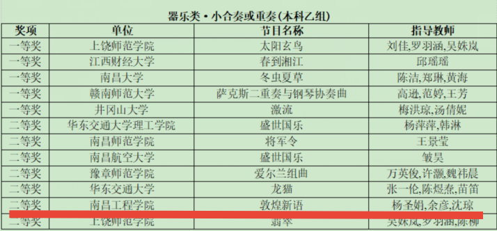 近日,江西省第十届大学生艺术展演圆满落下帷幕。我院选送的民乐合奏《敦煌新语》和双钢琴演奏《胆小鬼 第三乐章》两支曲目,在杨圣娟老师、沈琼老师、余彦老师的悉心指导下,依靠扎实的演奏基础和出色的专业技艺,得到了组委会专家评委的高度认可,均获得本科乙组(专业组)二等奖,再次为我校斩获殊荣。通过本次展演,展示了近年来音乐学专业学科建设成果,收获珍贵的荣誉之余,也进一步巩固了音乐学专业在全省学科建设的梯队名次,更为接下来的学科建设、教学科研活动找准了方向。
