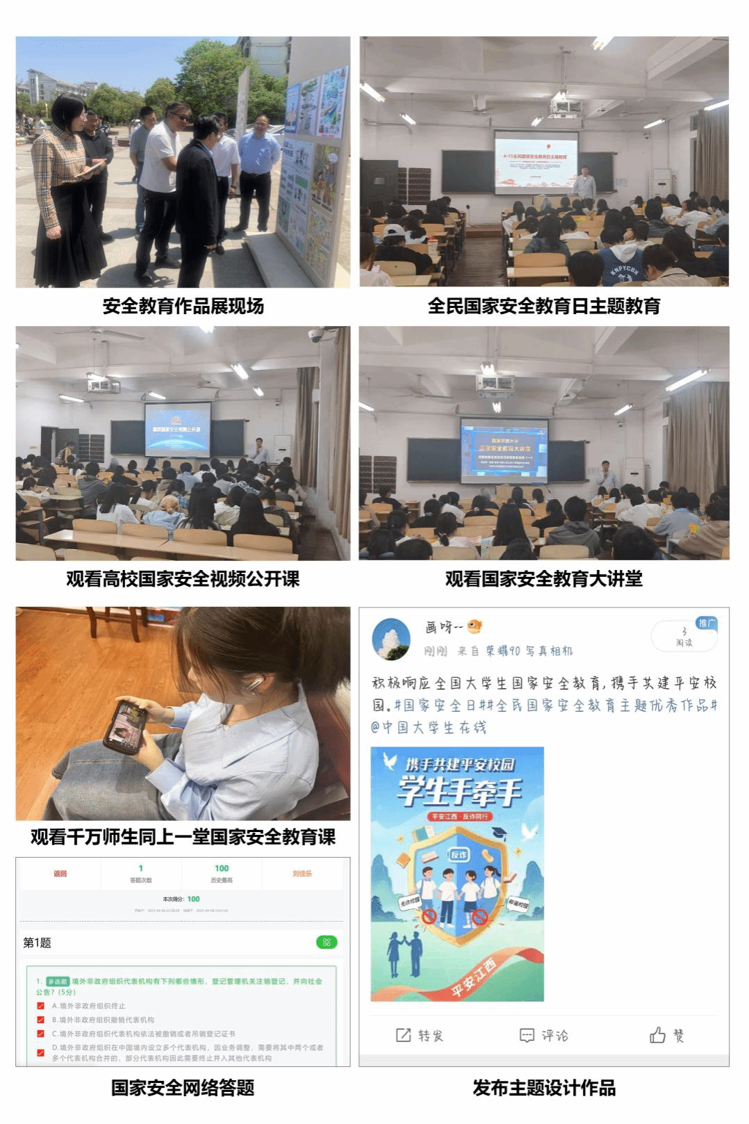 活动中,学院结合工作要求,多维度开展相关活动。一是开展专题学习与沉浸式教育,4月14日晚,学院组织2024级新生代表、学院学生干部100余人在教学南大楼B315集中观看“高校国家安全视频公开课”及“国家安全教育大讲堂”精选课程,内容涵盖网络安全、文化安全等热点领域;二是组织“千万师生同上一堂国家安全教育课”活动,4月15日当天,学院通过班级群、学生干部群等渠道,动员全体学生通过中国大学生在线视频号、微博等平台观看国家安全教育公开课;三是组织全院学生参与国家安全知识网络答题活动,4月10日至18日,学院组织全体在校生通过APP、微信公众号、网站等形式参与“全国大学生国家安全知识答题”活动;四是创作主题作品,营造宣传氛围,鼓励学生围绕国家安全主题创作海报、短视频、征文等作品,通过抖音、B站、微博账号等带话题发布优秀作品。